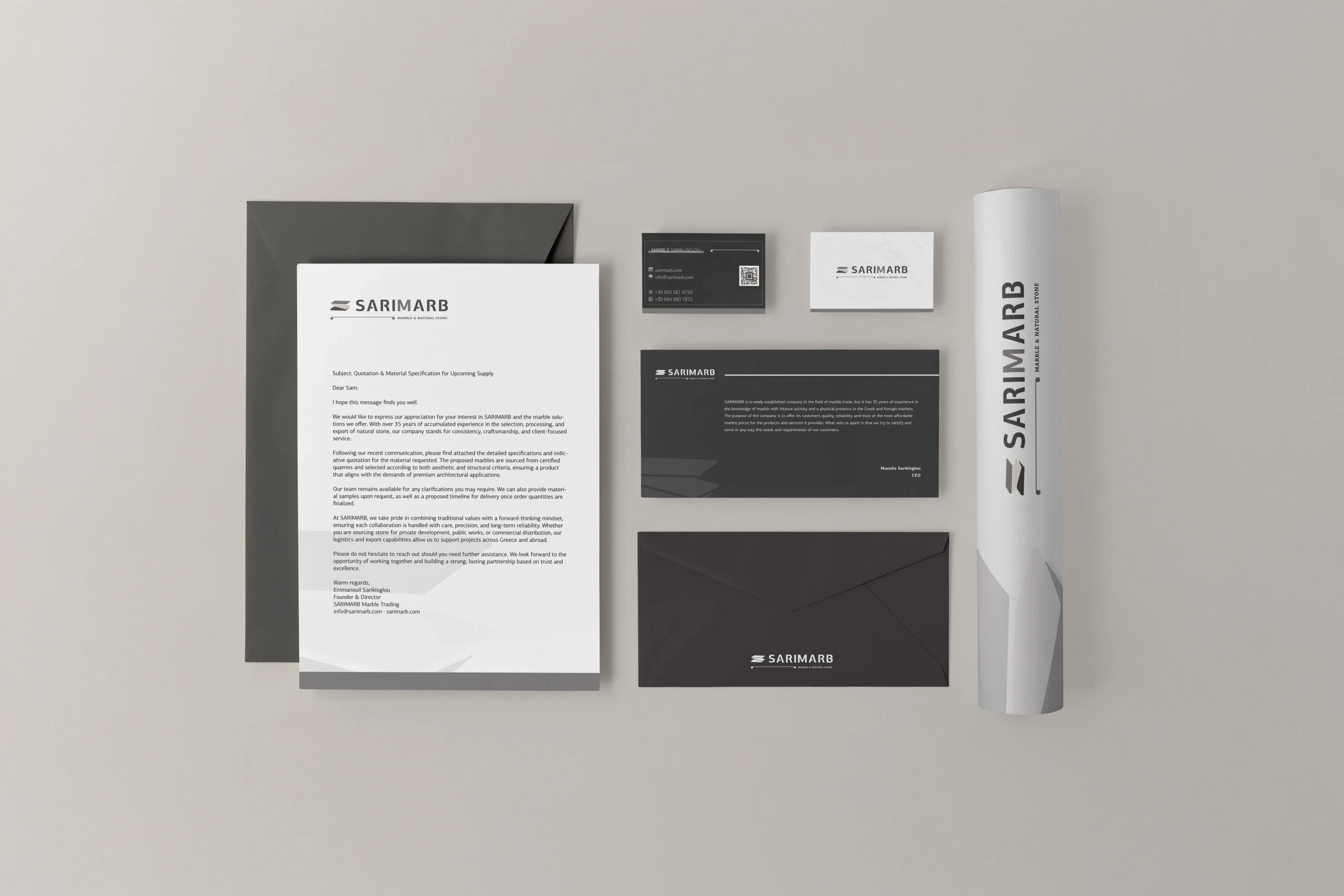 The final identity gives SARIMARB a strong, memorable presence that connects classical Greek heritage with a clear contemporary visual language. It is designed to be adaptable across print, packaging, digital platforms, and architectural applications ensuring visual consistency as the brand continues to grow in domestic and international markets.